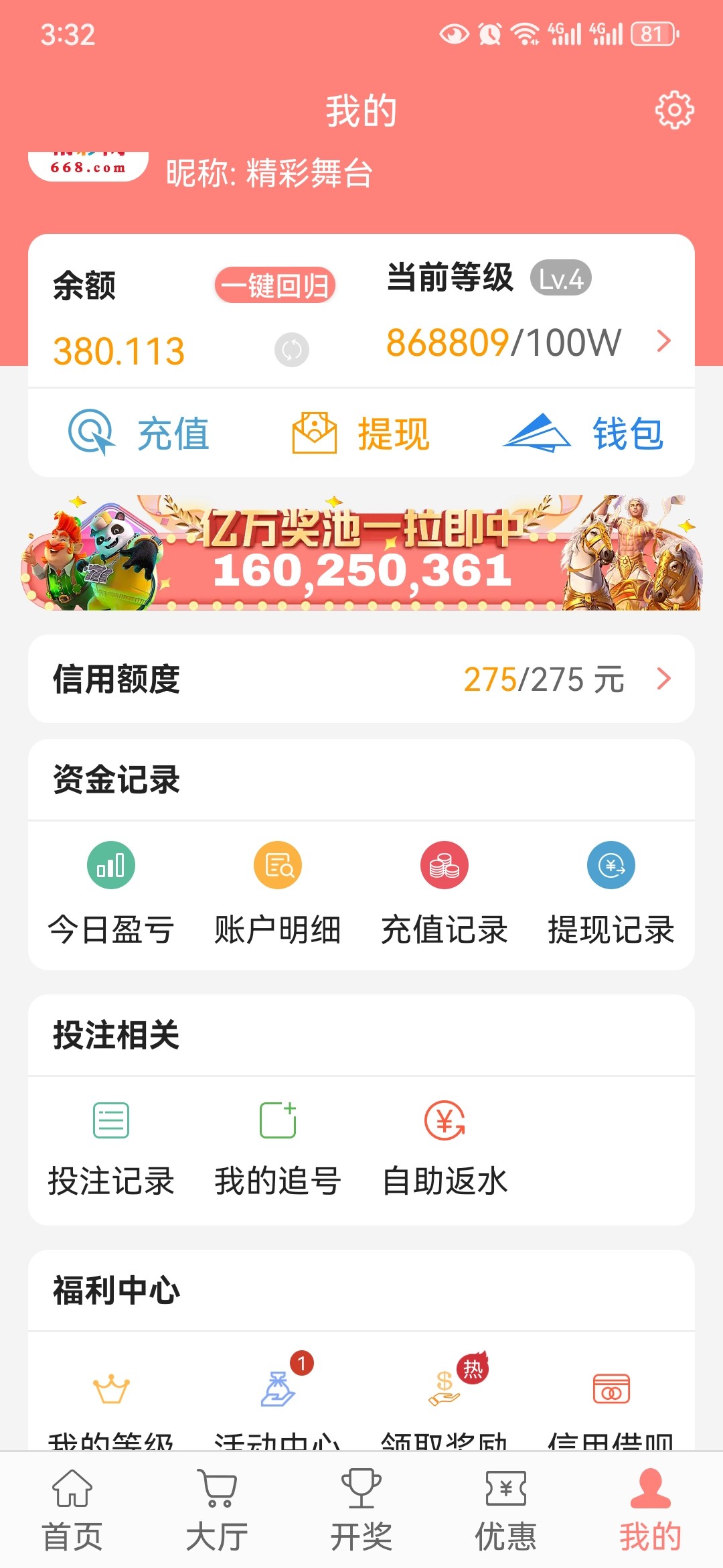 这个平台出款还是不黑,我已经亲测过了。只是说他这个注册的1000块需要在时间到达之前一周充够500块就可以了,其余其实就可以不用玩,昨天领了300块没打出来,自己充值还赢一点,也可以一百二百的冲,不要想着赢钱,打够流水就直接走人,往复充提,我是打的彩票