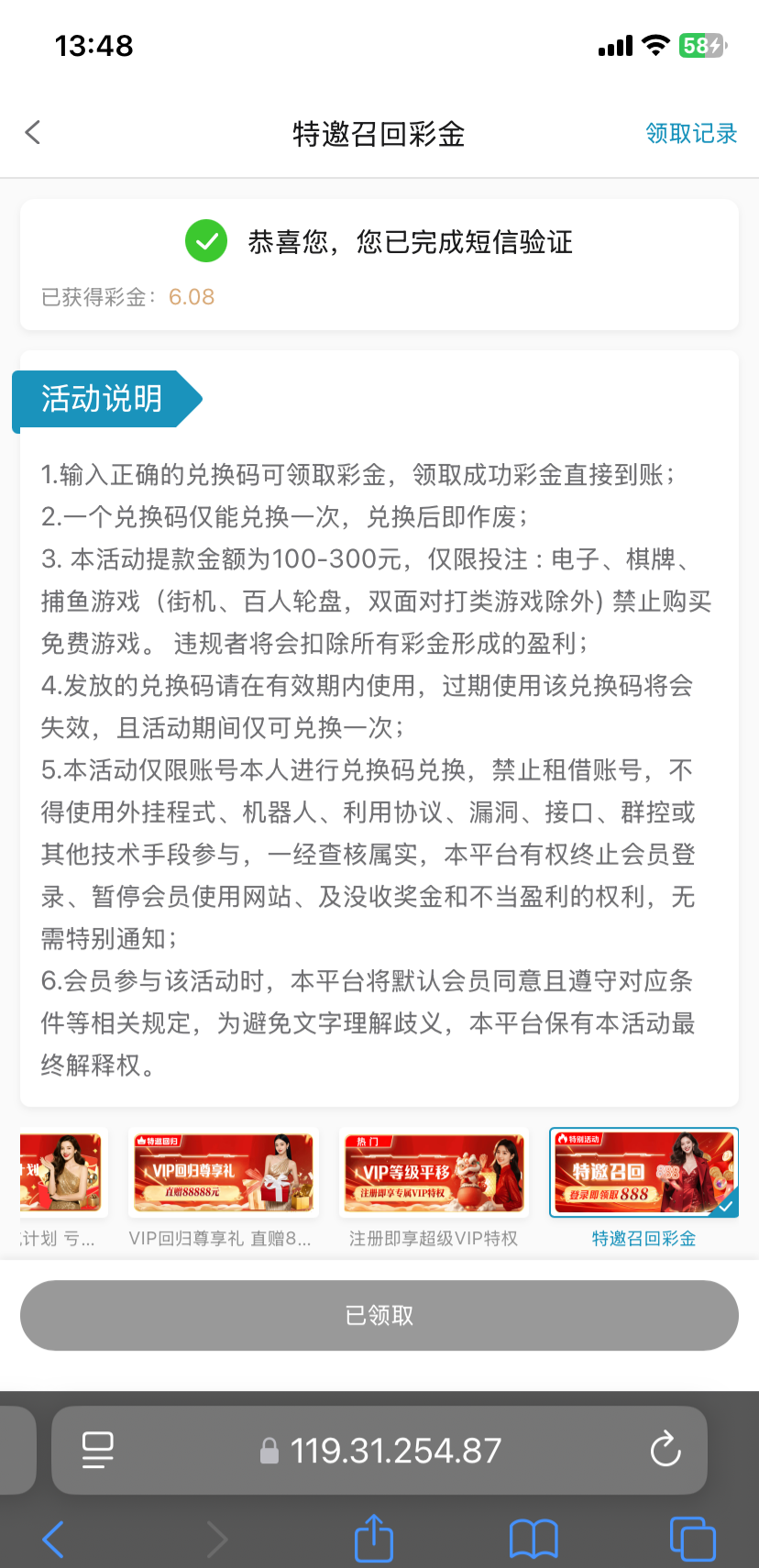 优惠里面用手机号领取6元,只能提现100-300