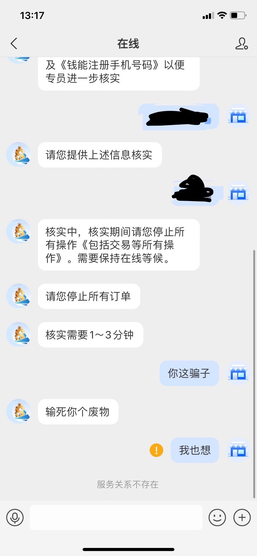 兄弟们注意了,现在骗子真的是出其不意攻其不备的,在你卖币的时候,他会进行抢单然后支付0.1给你,完事就取消订单,冒充钱能客服找到你,老骗取你的资料来盗号,最后被我发现恼羞成怒
