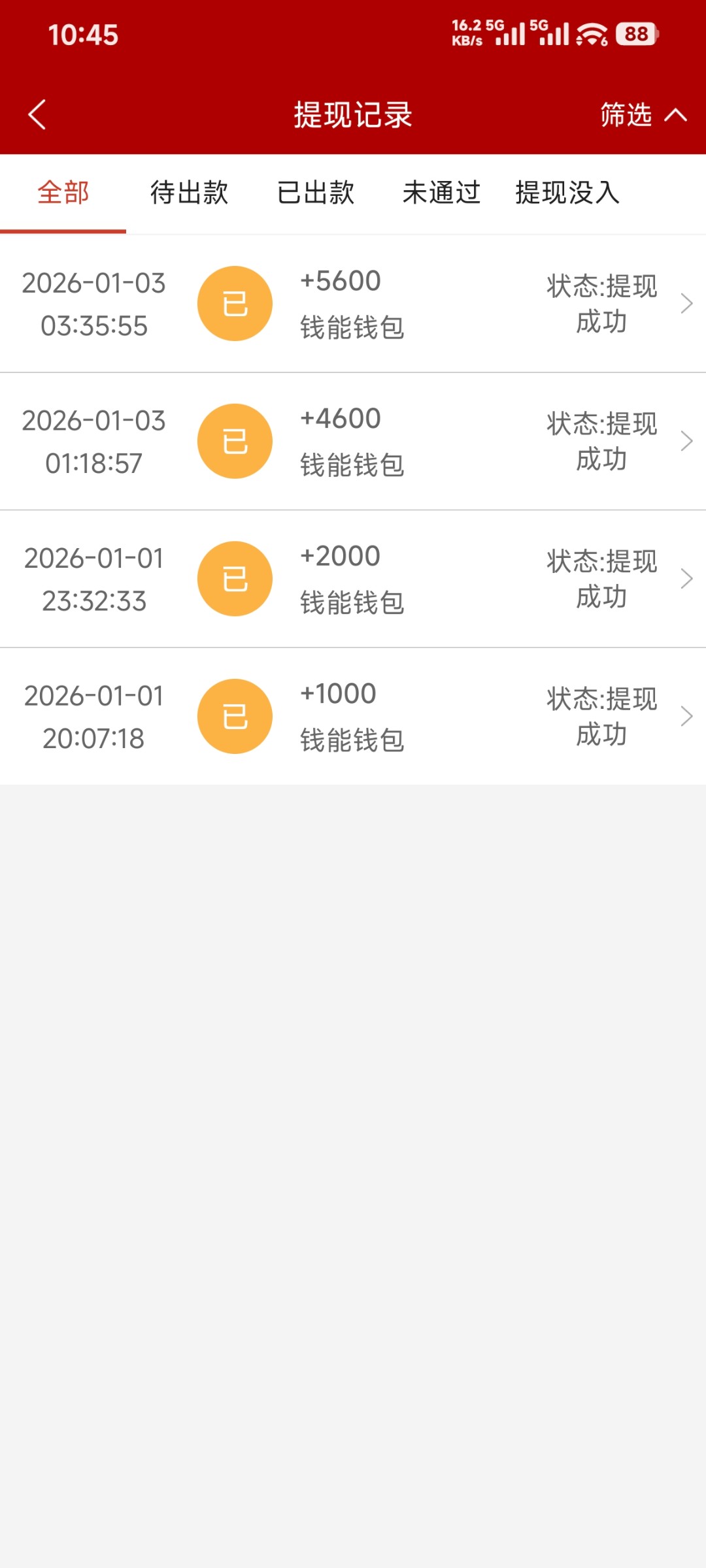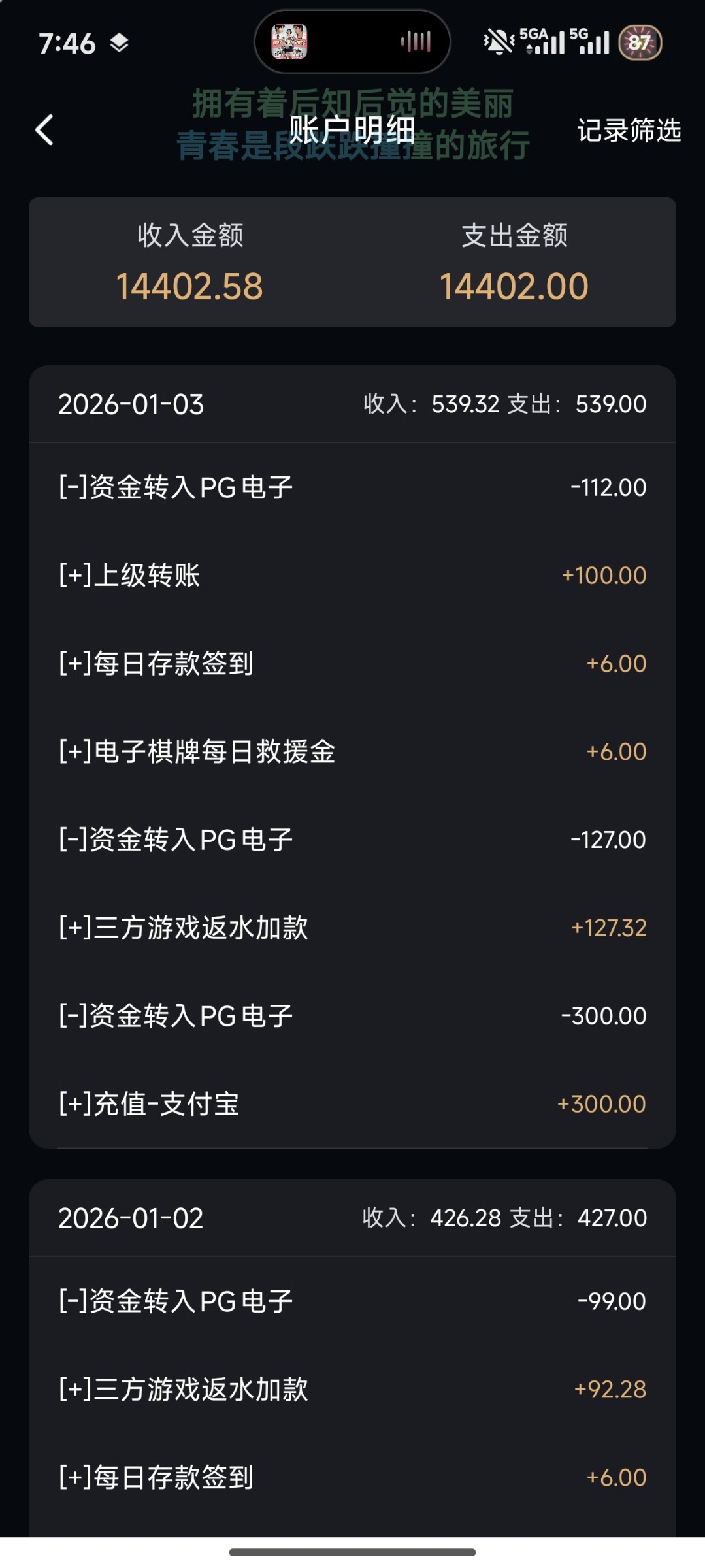 31号皇冠充值100上1500 然后玩百胜一直赢了有两千吧 后面又去星耀 差点给我干挂壁了后面也赢了1000 跨年给女朋友转了888本来以为今年开门红会起飞 结果才赢了4000昨晚就送回去了 唉总体来说也盈利 刚刚星耀60麻2上160不知道是想上200还是想进一次女王免费 也没了 明天返水有200 等达标688 明天还有皇冠争霸 希望回点 1000就可以了