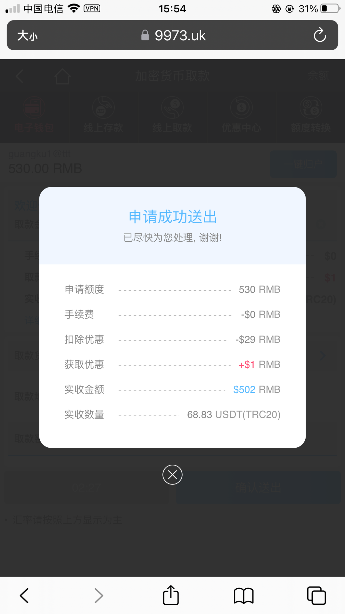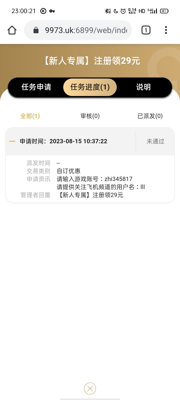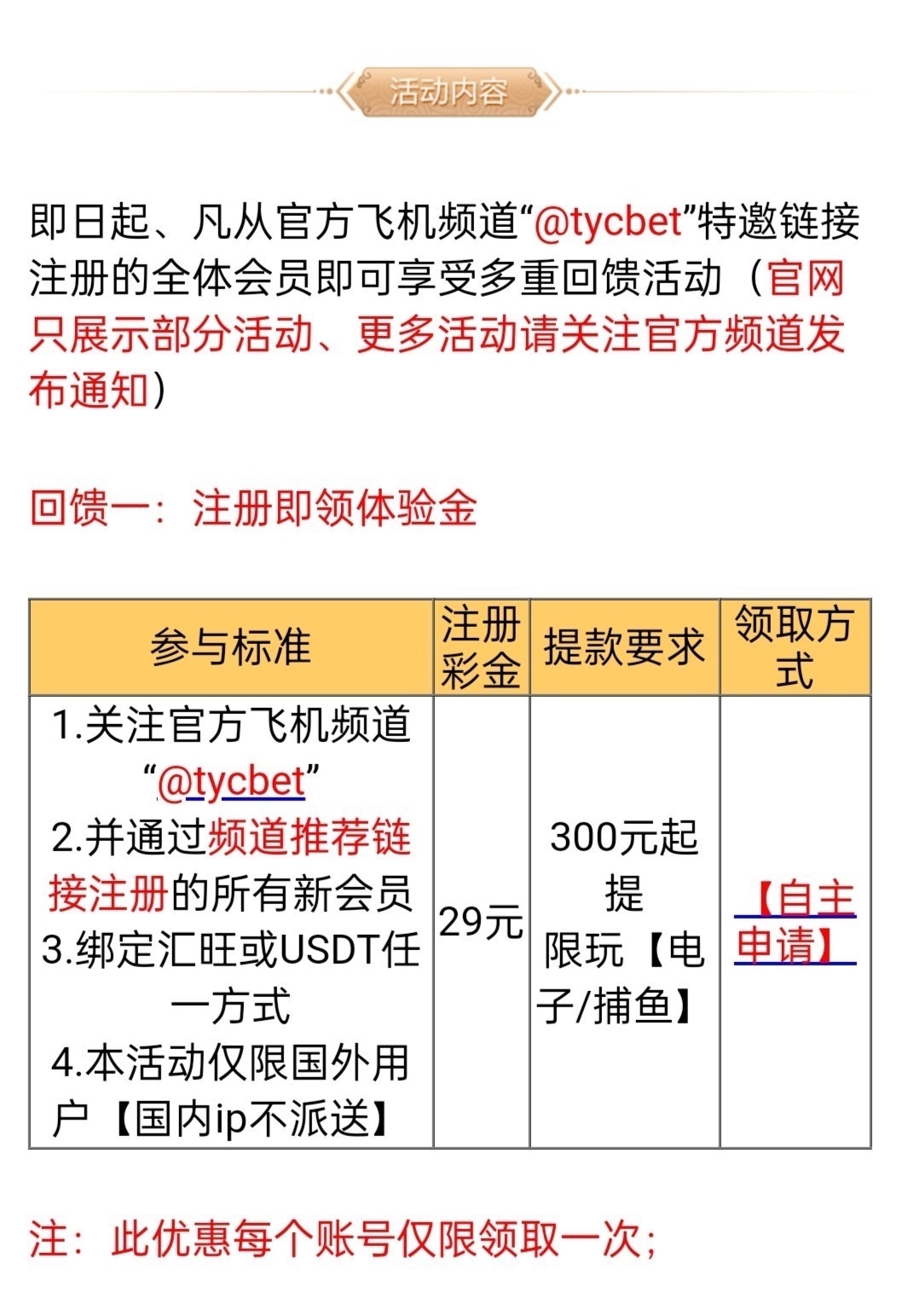 新用户必须使用vpn挂国外网络 不可以使用国内的网络 注册绑定usdt地址 优惠里面自助申请29元彩金 1小时内自动到账 亲测撸了两个号都送了