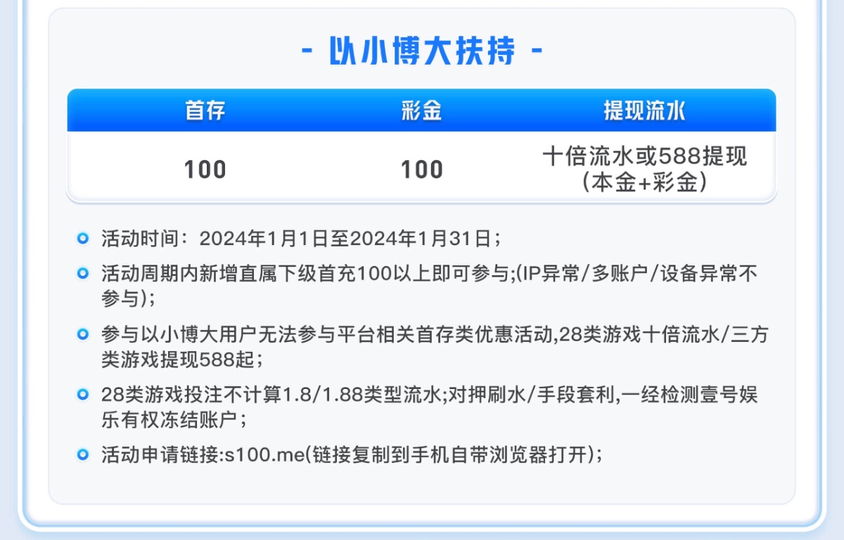 * 开通合营代理新增直属下级享受以小博大扶持(100+100),以及自媒体扶持等渠道扶持;