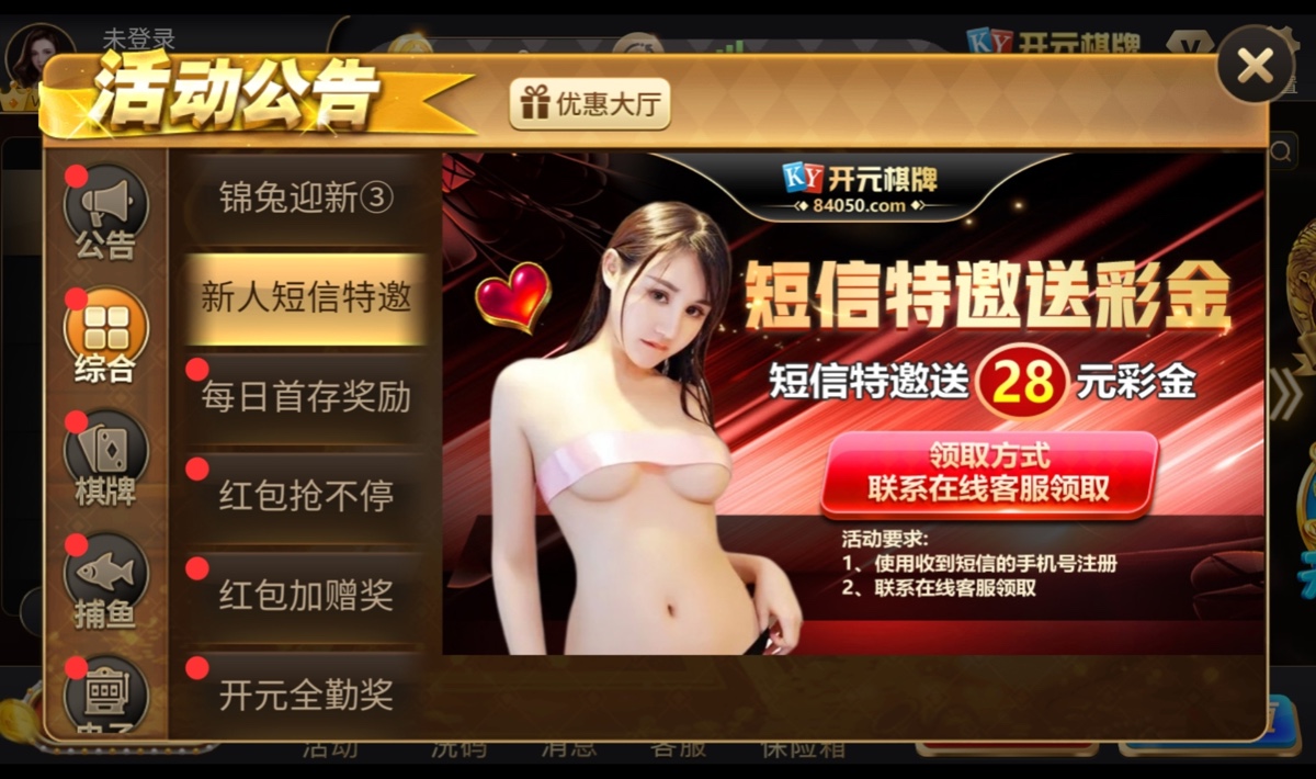新用户注册完善资料,联系客服申请特邀彩金28,直接发手机号还有ID过去,不用短信。但是查特邀名单,反正我没有收到短信也送了。就算不送也没关系多注册这种平台特邀短信才多。