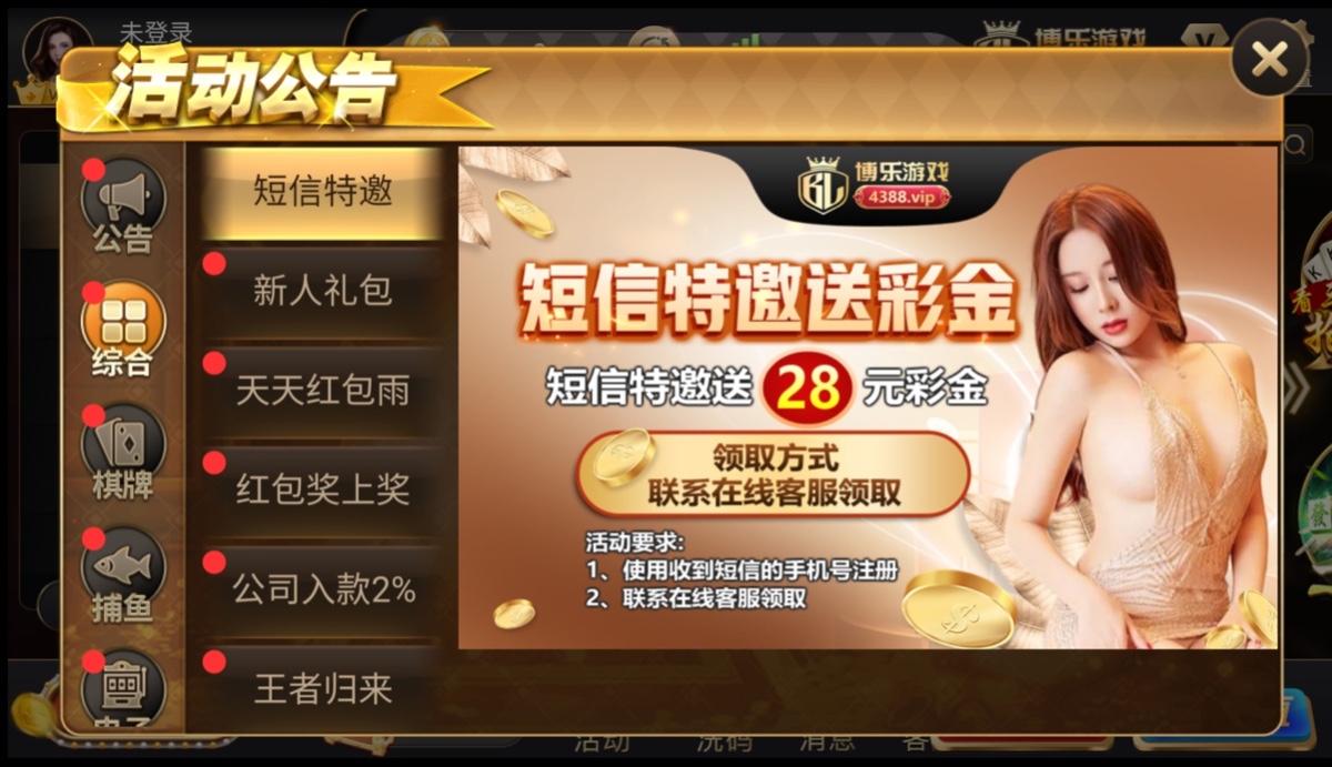 新用户注册完善资料,联系客服申请特邀彩金28,直接发手机号还有ID过去,不用短信。但是查特邀名单,反正我没有收到短信也送了。就算不送也没关系多注册这种平台特邀短信才多。