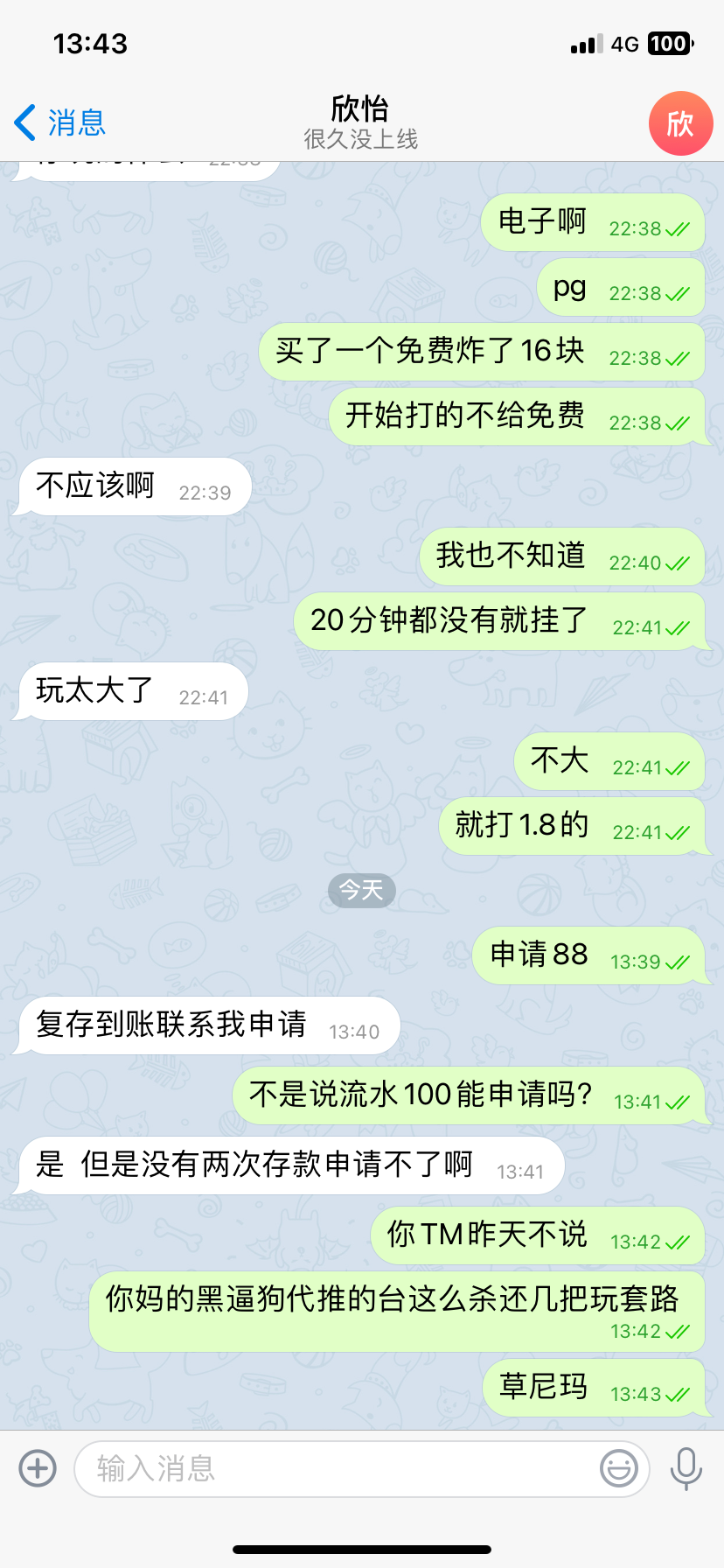 说存100+100流水满一百申请88杀的跟狗一样