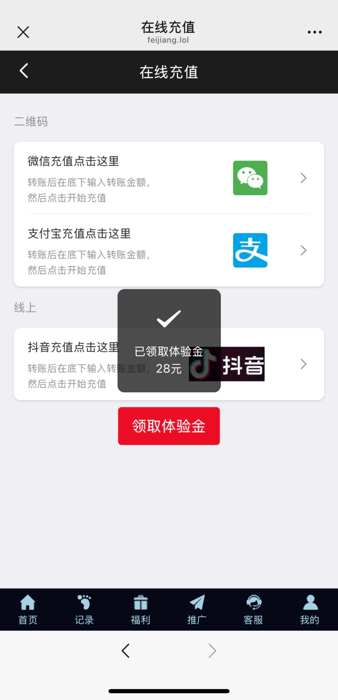 微信扫码登录,充值里领取体验金秒送28!