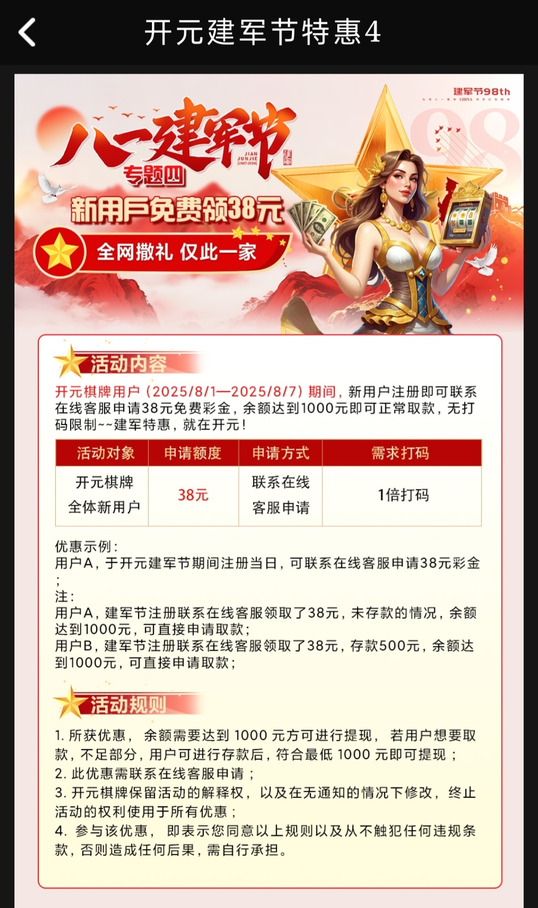 活动7天时间注册申请38彩金,具体规则看活动图 勿充值自测