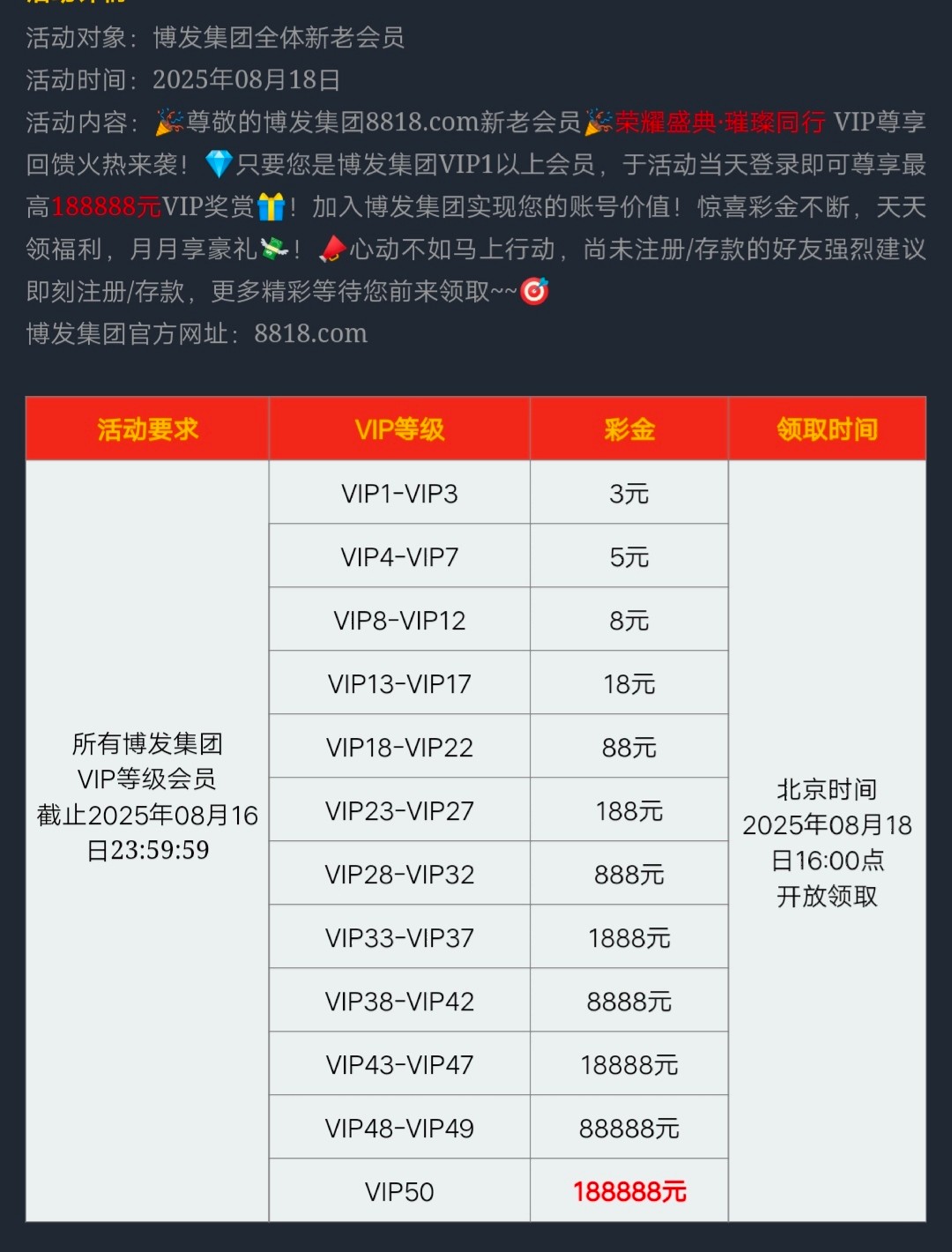 截止8月16日23:59前注册的会员,享有8元/18元的回馈金,出款流水详情看规则介绍;
