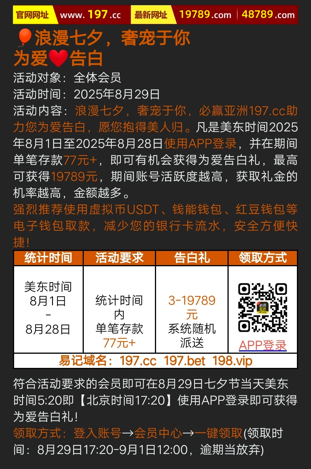 凡是美东时间2025年8月1日至2025年8月28日使用APP登录,并在期间单笔存款77元+,即可有机会获得为爱告白礼,详细看活动介绍。