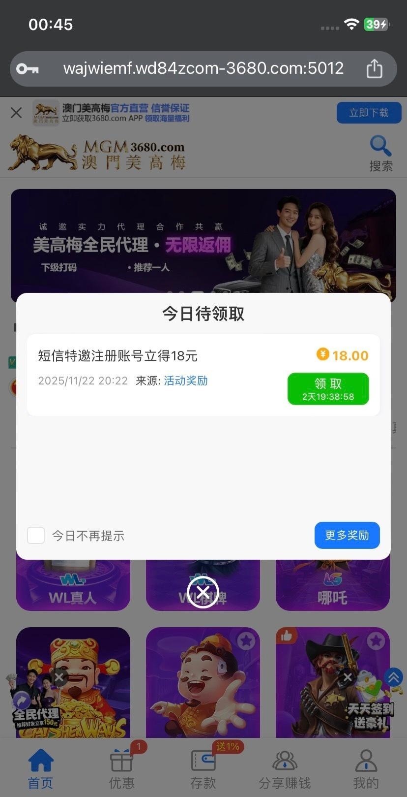 澳门美高梅3680 特邀发短信送18。前两天发了短信没有送的上去看看 我也是发了没有送 我刚刚看到邮箱发来信息登录上去看到送了18 网址3680.com 前两天发时候没有送 今天看到邮箱上去送了