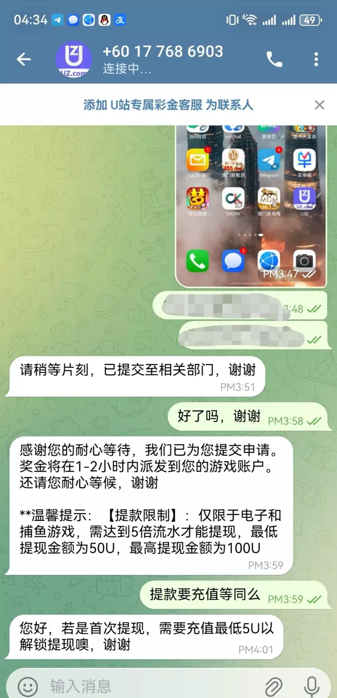 飞机上看到的,新人注册送9.99u,按客服要求绑定出款地址,关注频道就送,提款最低50u,需最低充值5u,我没打出来,老哥们可以去试试,网址uz.com