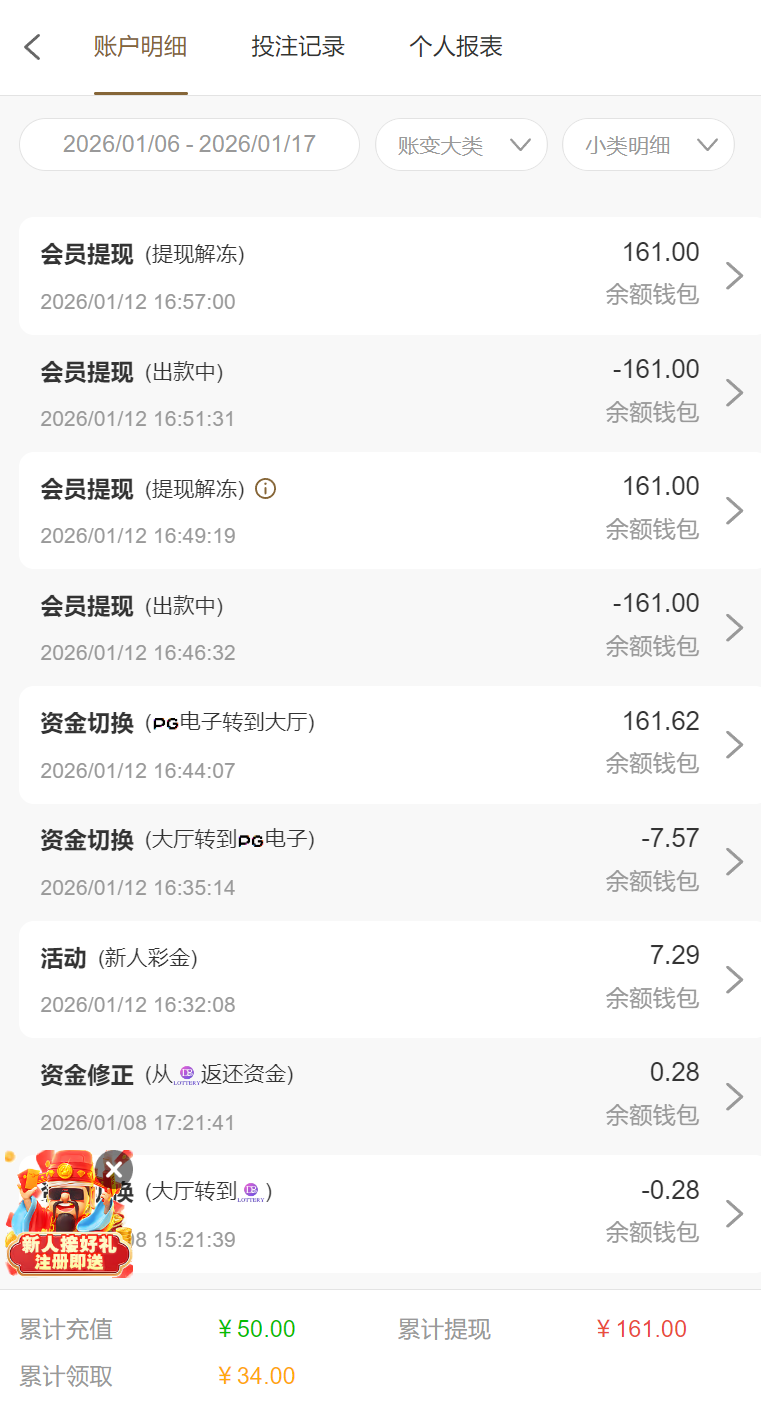 这个台半黑吧,我之前玩了多次,没提现过,前天的时候电话给我说回归彩金,我领了7块钱,拉麻一拉到161,提现到了,回冲50块钱,50块钱打到139,想着到150提现,结果后面一直输没了,总的来说送7块,提166秒到账回冲50输了,盈利110,反正一分没充