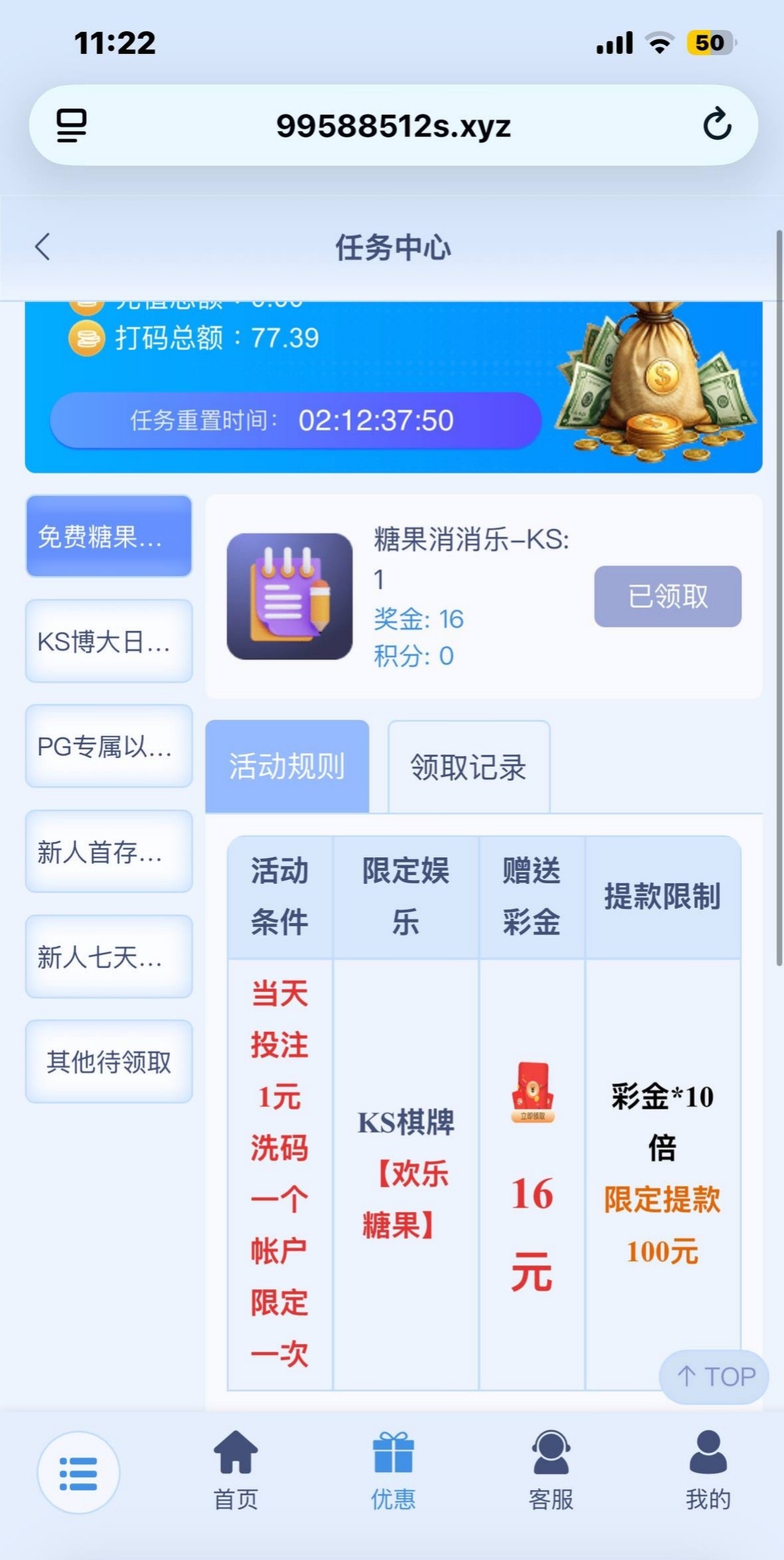 拿返水投1块钱就能领16元,只能打欢乐糖果,一注两块有水,提了100,梦想有号的可以去搞一波