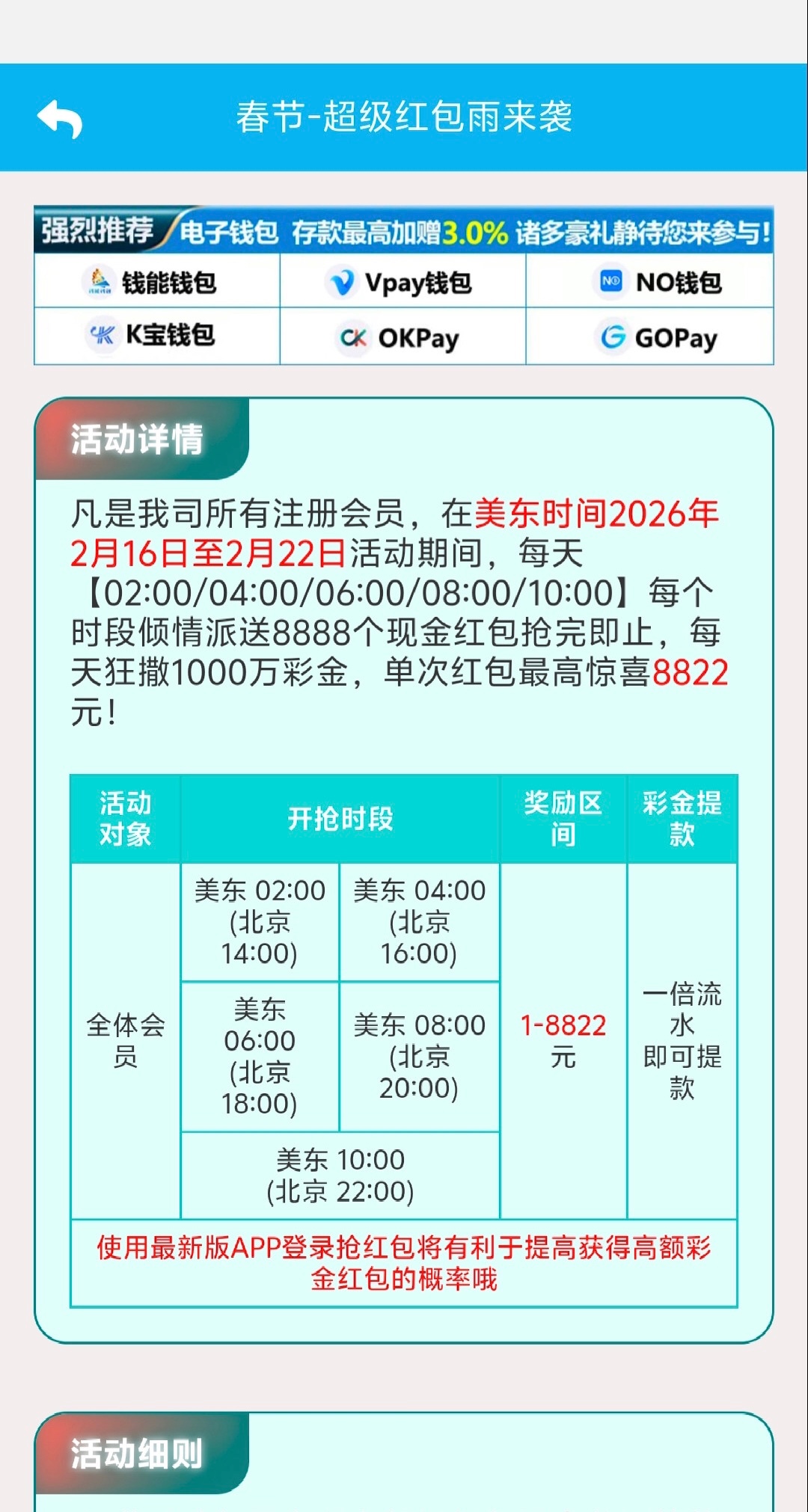 8822.com有回馈彩金,2025.1.1到2026.2.14有充值的可以到下午1点查看领取回馈彩金还有红包雨,吊大的大哥可以博一下