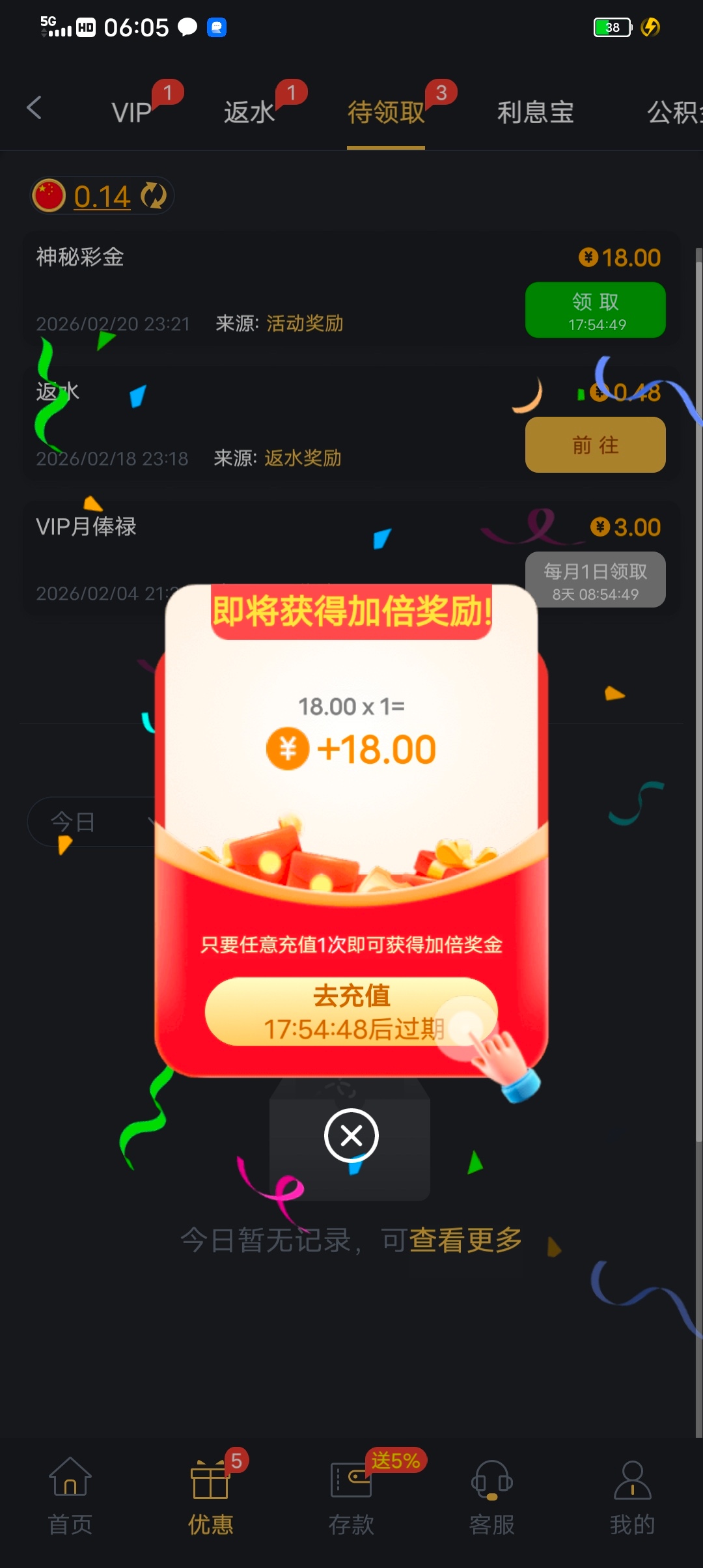 神秘彩金18,充值18再送18