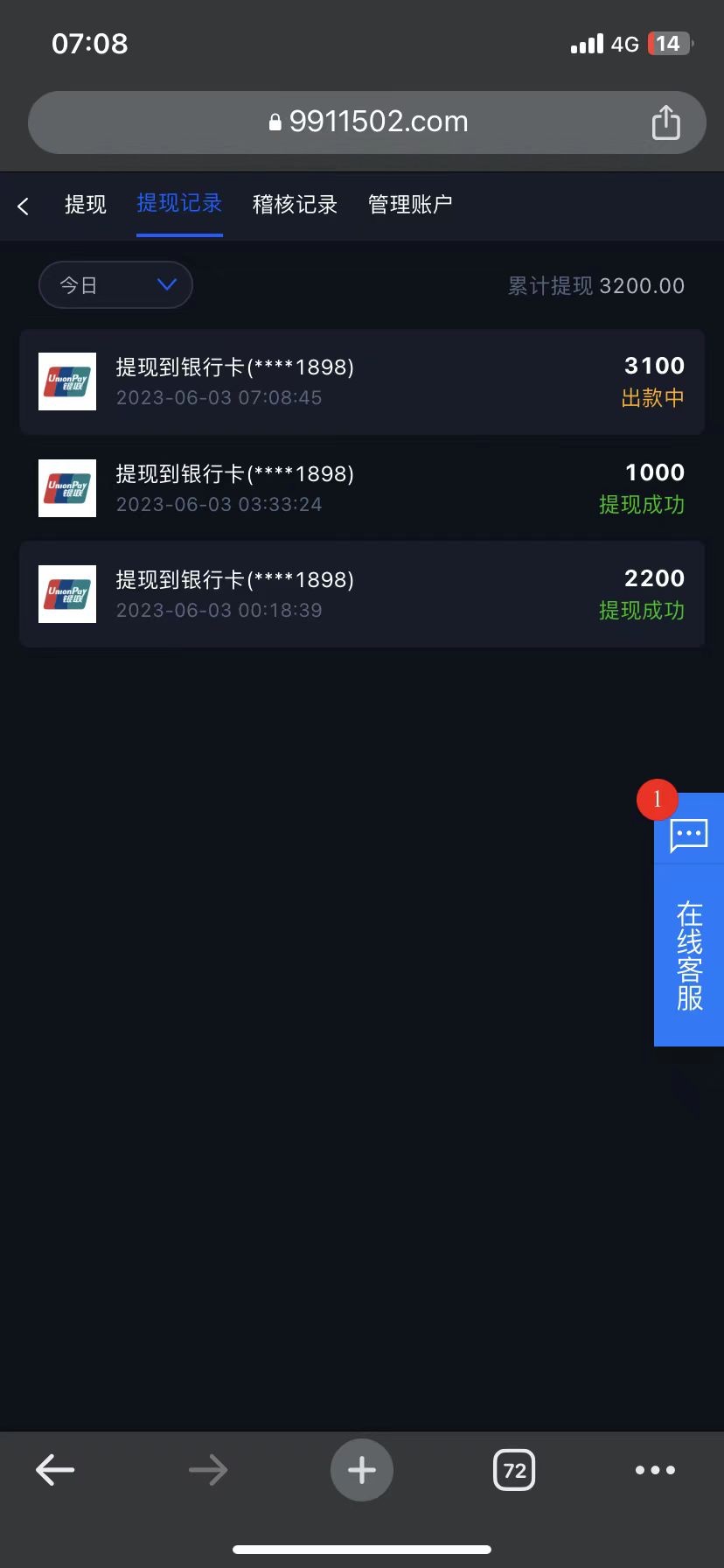 存一千干到三千  取了两个多小时了  一直打款中  客服直接不回消息  多半凉了