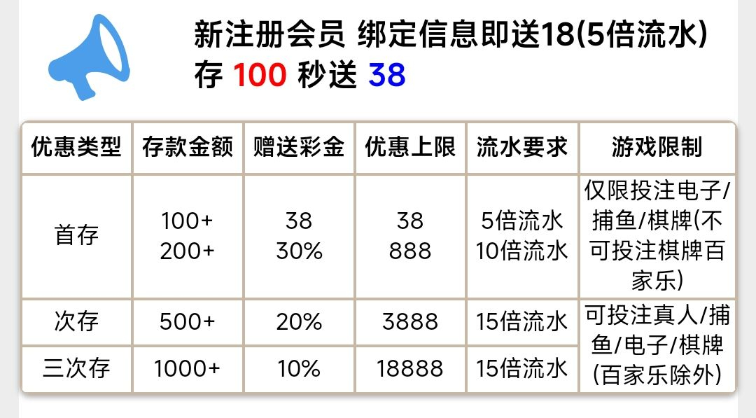 注册送18,注册绑卡,验证手机号跟密保,找客服申请,没有游戏限制,五水,满百提。