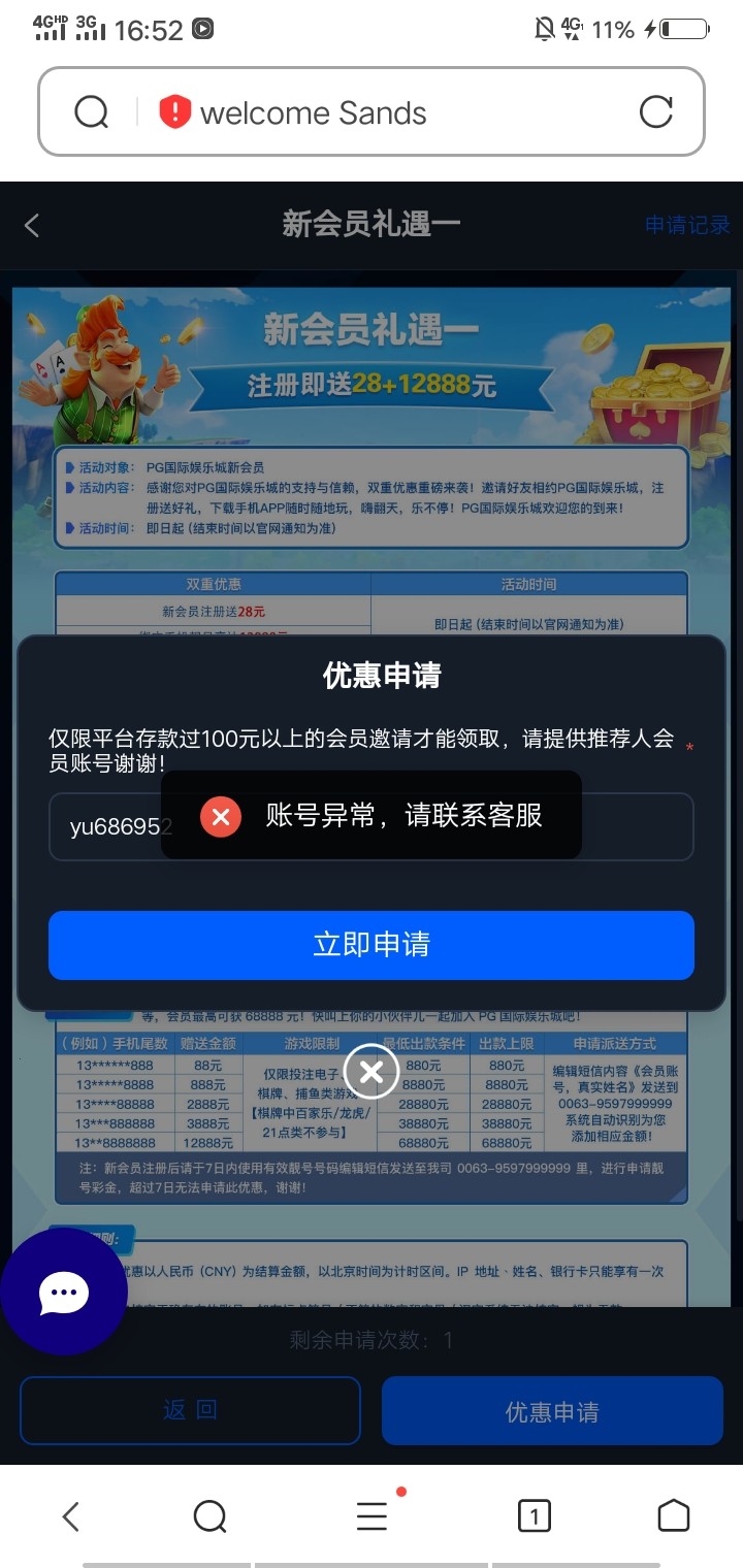 楼主,你账号没有充值过一百,请不要分享出来,每人只能申请一次,你这一个账号发出来又没充值,我们就白白浪费了名额了